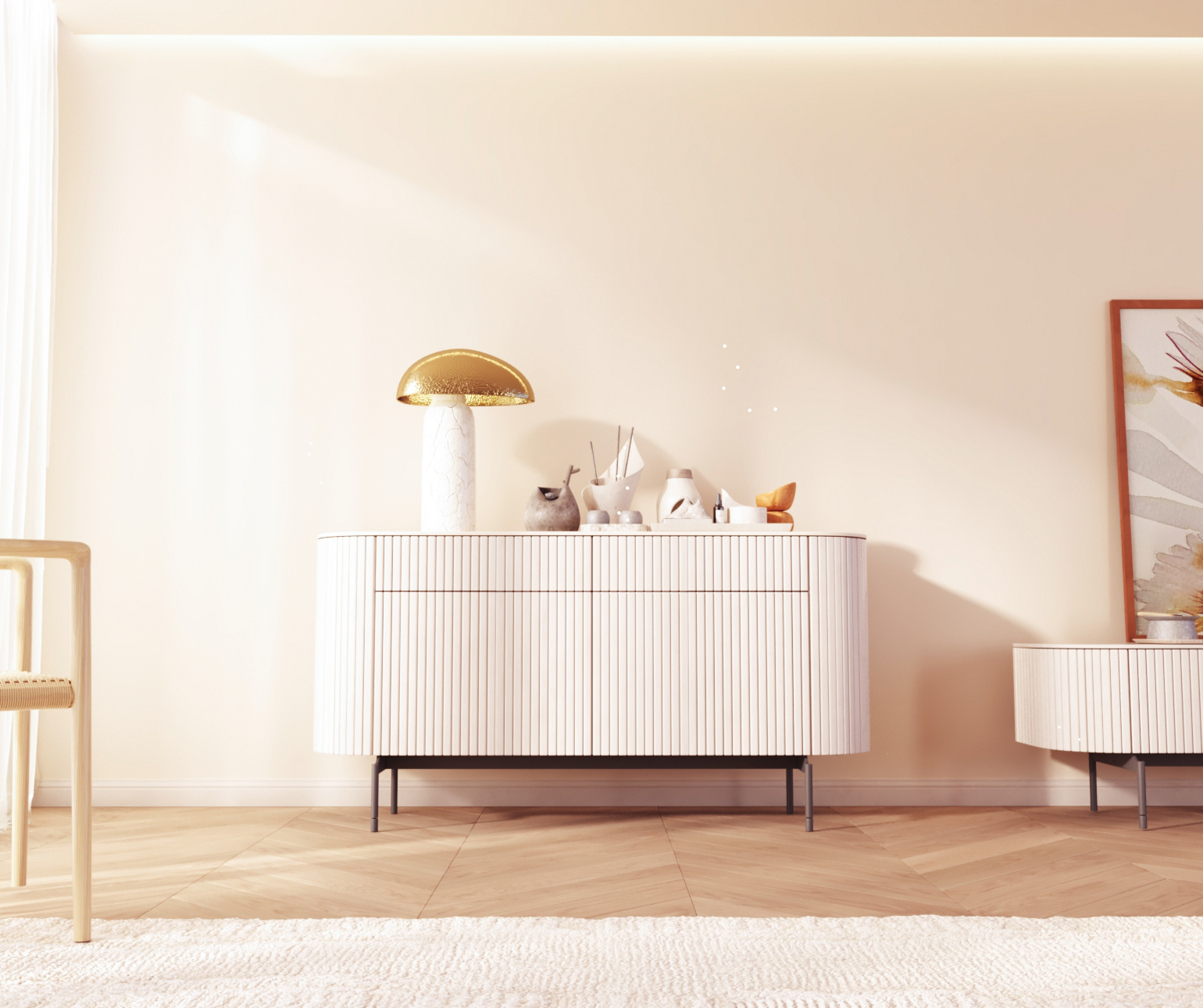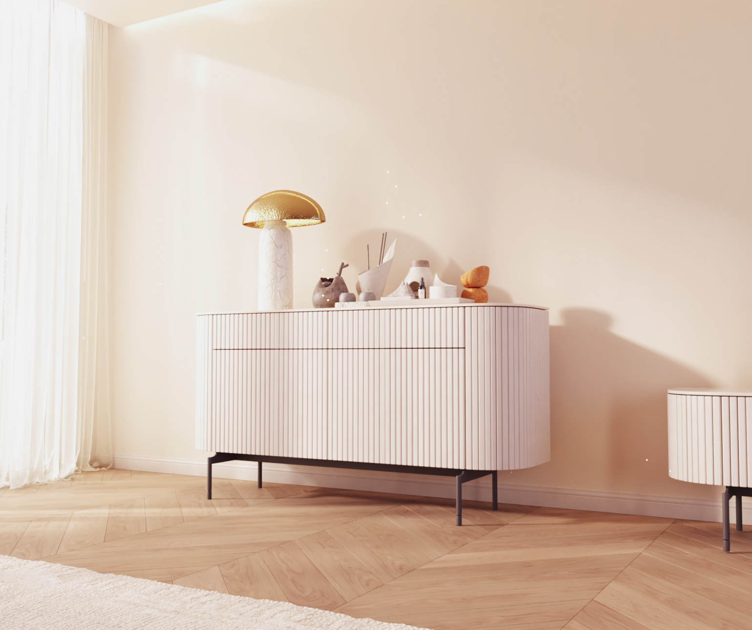 Líneas suaves, materiales nobles y una estética contemporánea definen esta pieza exclusiva de Luca Atelier. El frente está trabajado con una palillería de madera natural lacada en blanco que no solo aporta ritmo y textura, sino que acompaña de forma orgánica las esquinas frontales curvadas del mueble, creando un efecto visual envolvente y armonioso. La tapa superior, también en roble, remata el diseño con una superficie continua y también curvada en las esquinas.