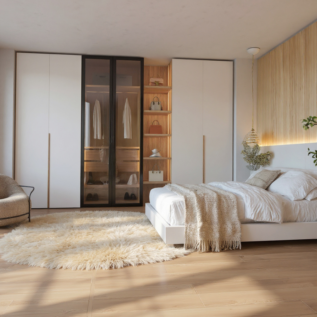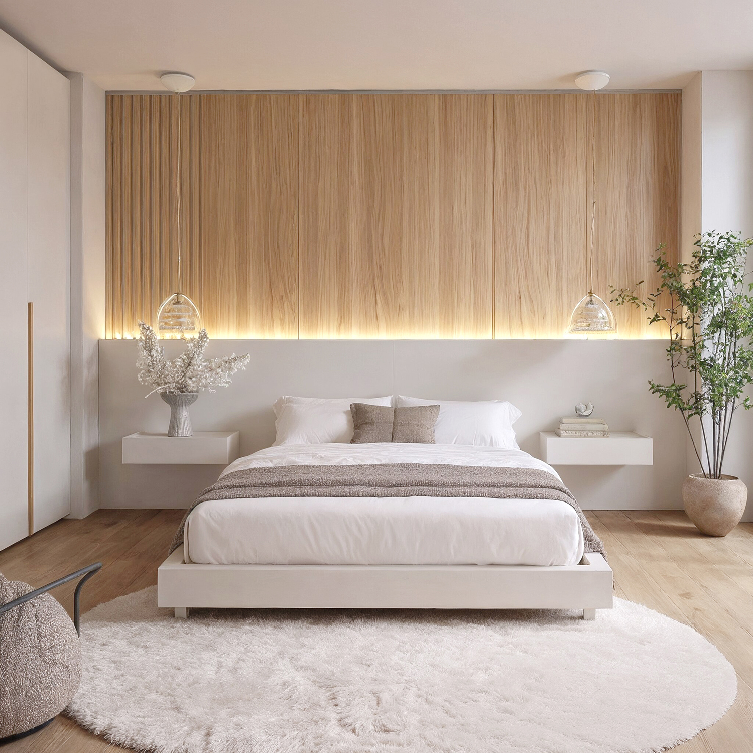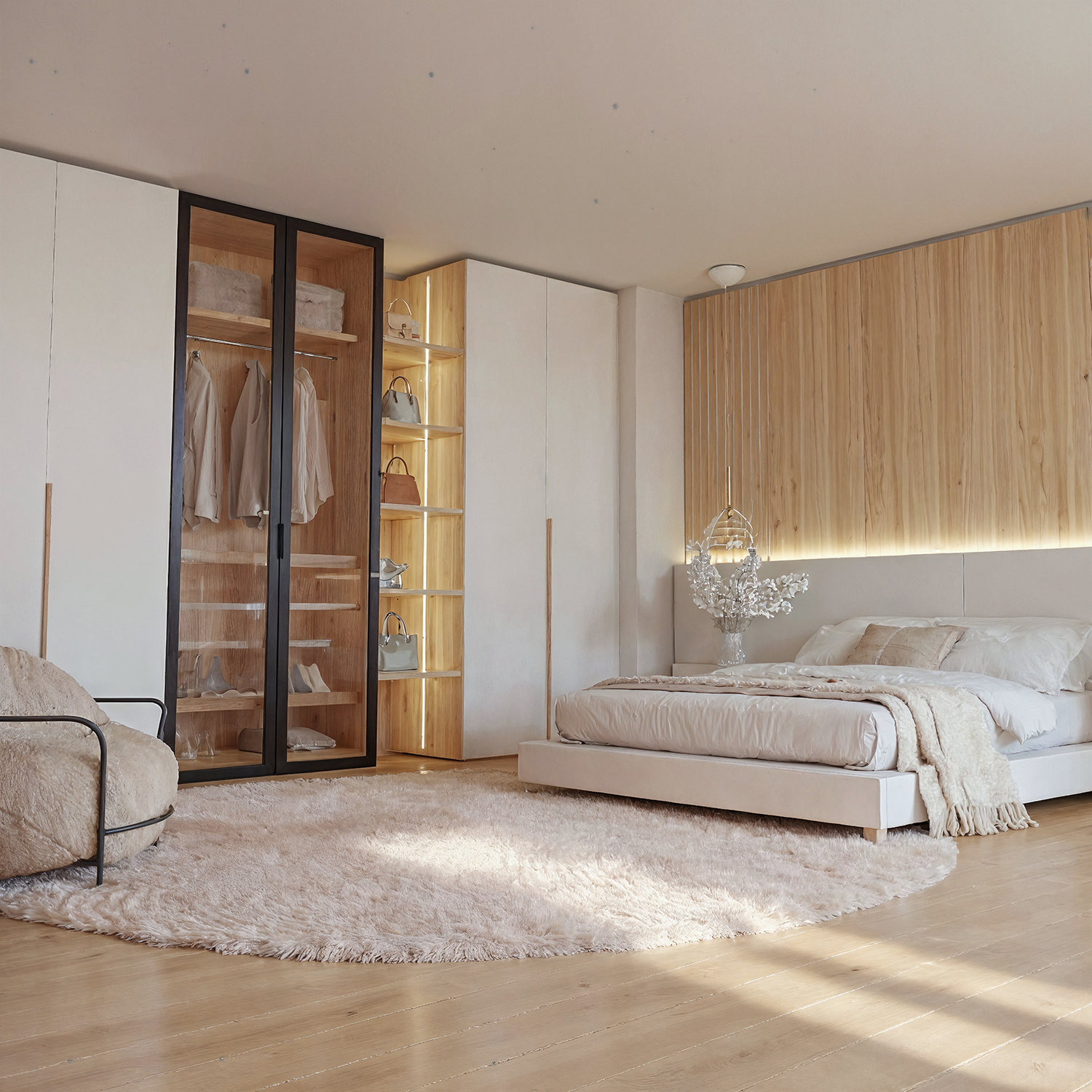 Iluminación LED integrada vertical en el interior de armarios/vitrinas y horizontal por encima del cabecero, pensada para bañar la madera y el lacado, realzar vetas y crear una atmósfera cálida y sofisticada. Los acabados combinan la luminosidad del lacado perla con la textura y tono del fresno olivato, una combinación habitual en nuestras colecciones de alta gama.