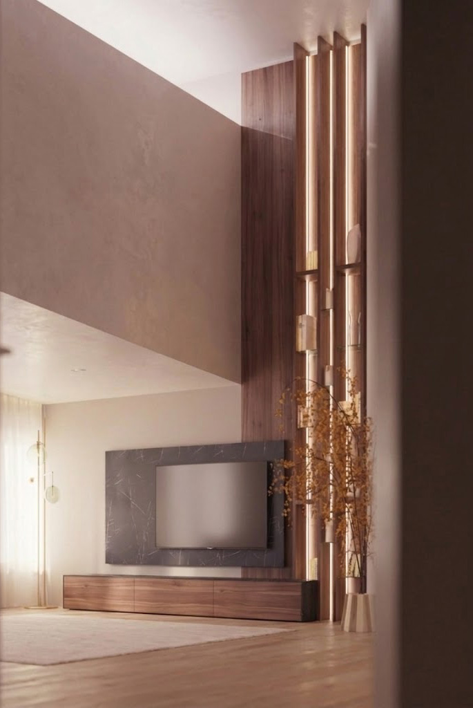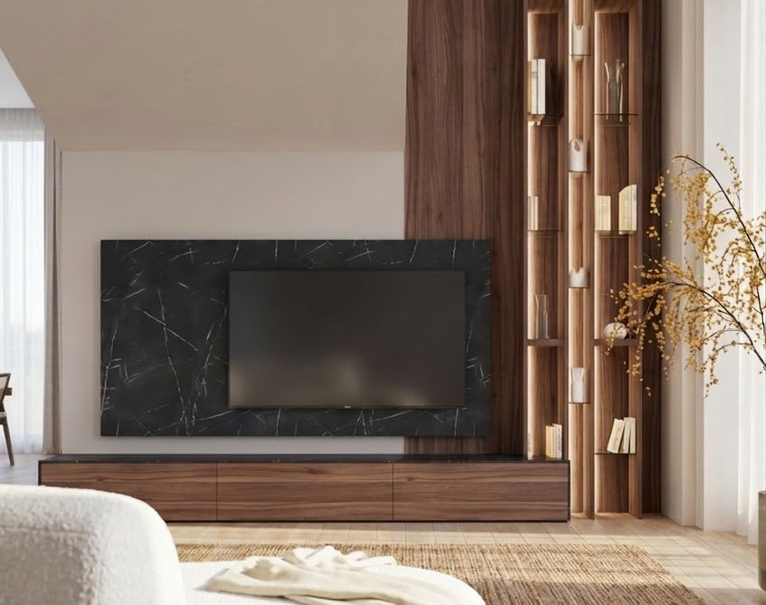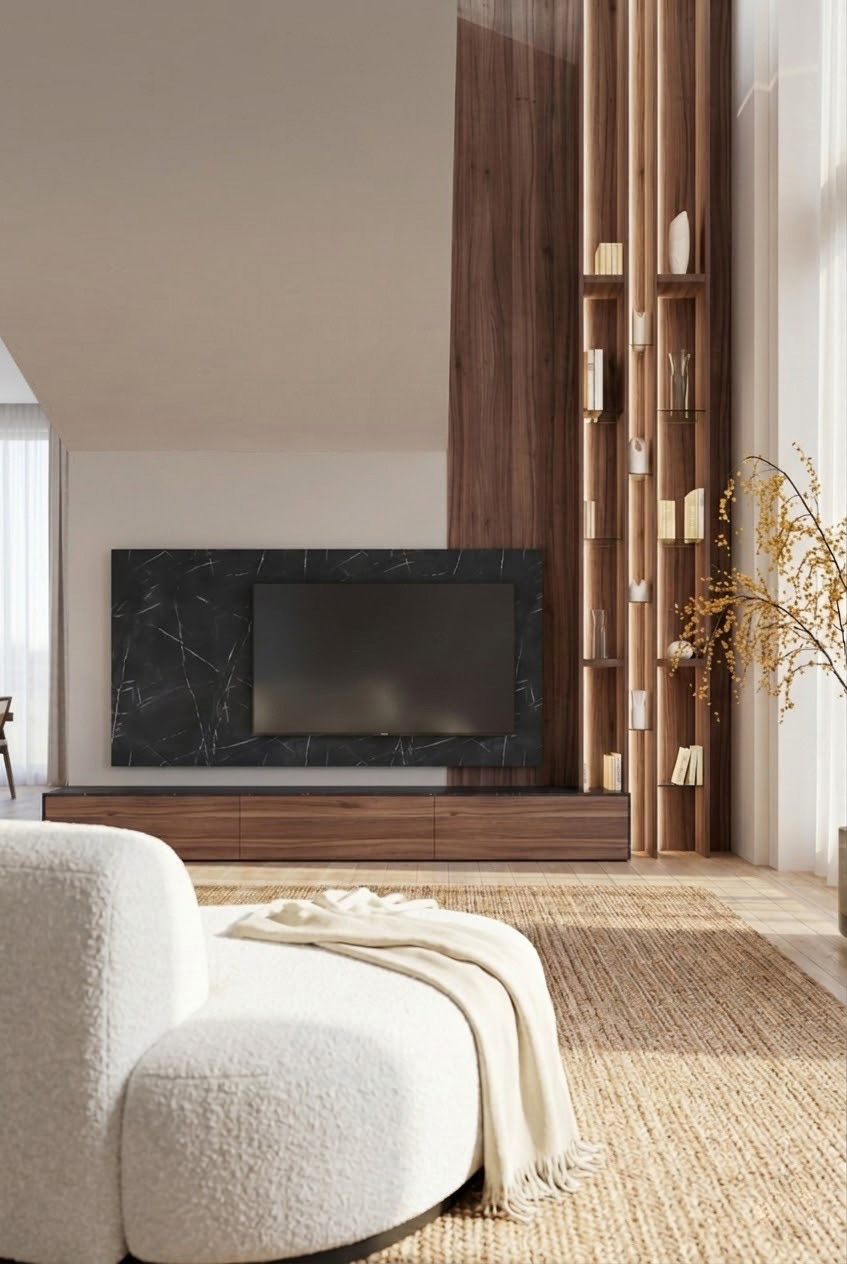 Presentamos este impresionante conjunto diseñado por nosotras para un cliente con una casa muy especial, las alturas de la sala principal que nos permitió diseñar este conjunto de mueble de televisión con librería, nos gustó mucho y lo ponemos como otro ejemplo de los muebles que somos capaces de hacer. Con sus acabados combinamos calidez, elegancia y una ejecución técnica impecable. El mueble bajo, acabado en laminado nogal Falla, incorpora tres amplios cajones que nos dan mucho espacio de almacenaje. Estos tres cajones quedan enmarcados por el revestimiento en laminado efecto piedra marquina, al igual que la trasera, creando un contraste sofisticado que enmarca la pantalla como una auténtica obra de arte.