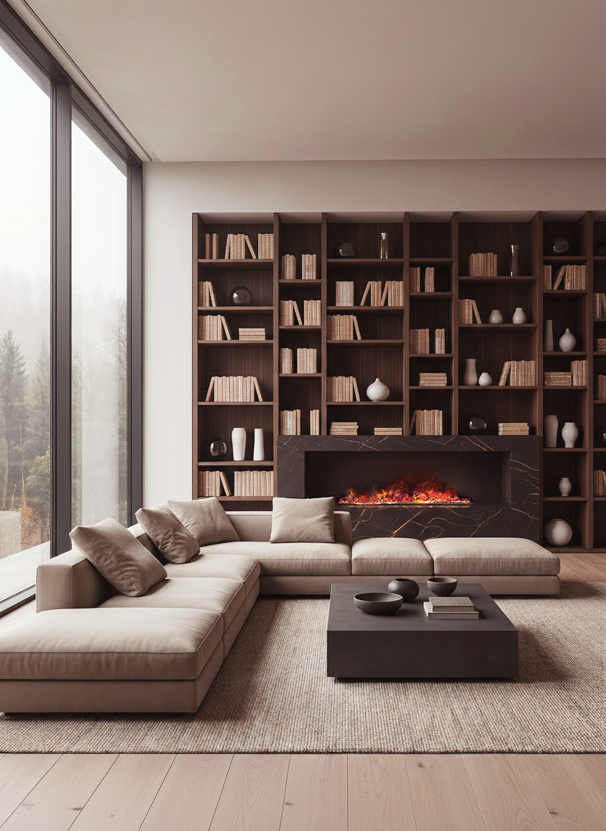 Librería a medida con chimenea de vapor.