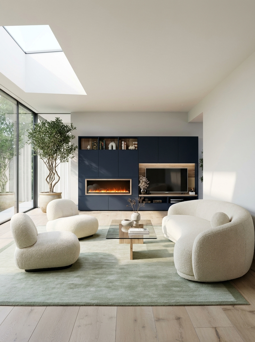 Está acabada en lacado azul océano y en madera natural de Fresno olivato en trasera, tapa en la zona de televisión y marco de la chimenea. La trasera queda iluminada con iluminación de tiras LED para resaltar esta bonita madera. El Fresno olivato es una variedad de fresno reconocida por el dibujo de contrastes que presenta de forma aleatoria y desigual en su beta.
