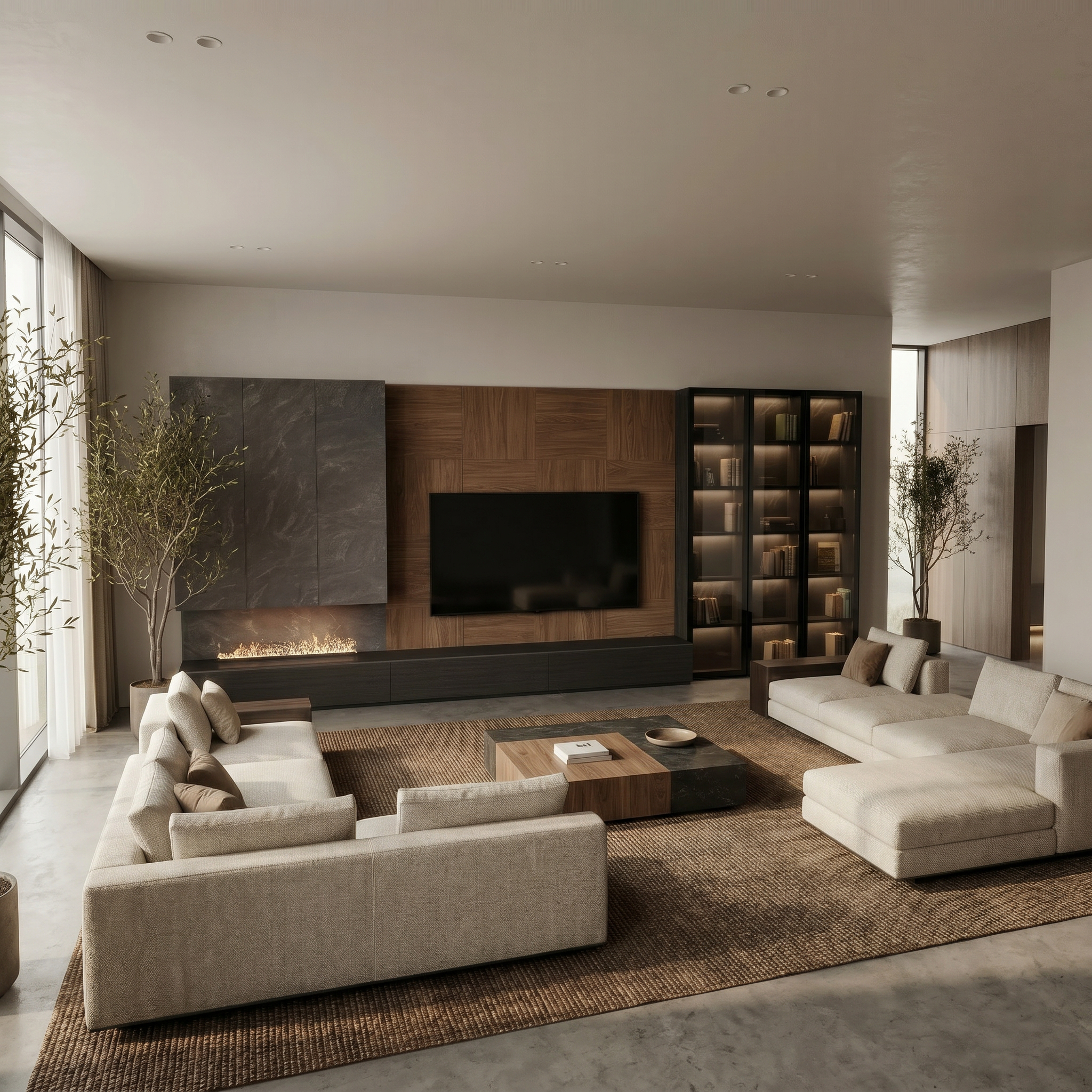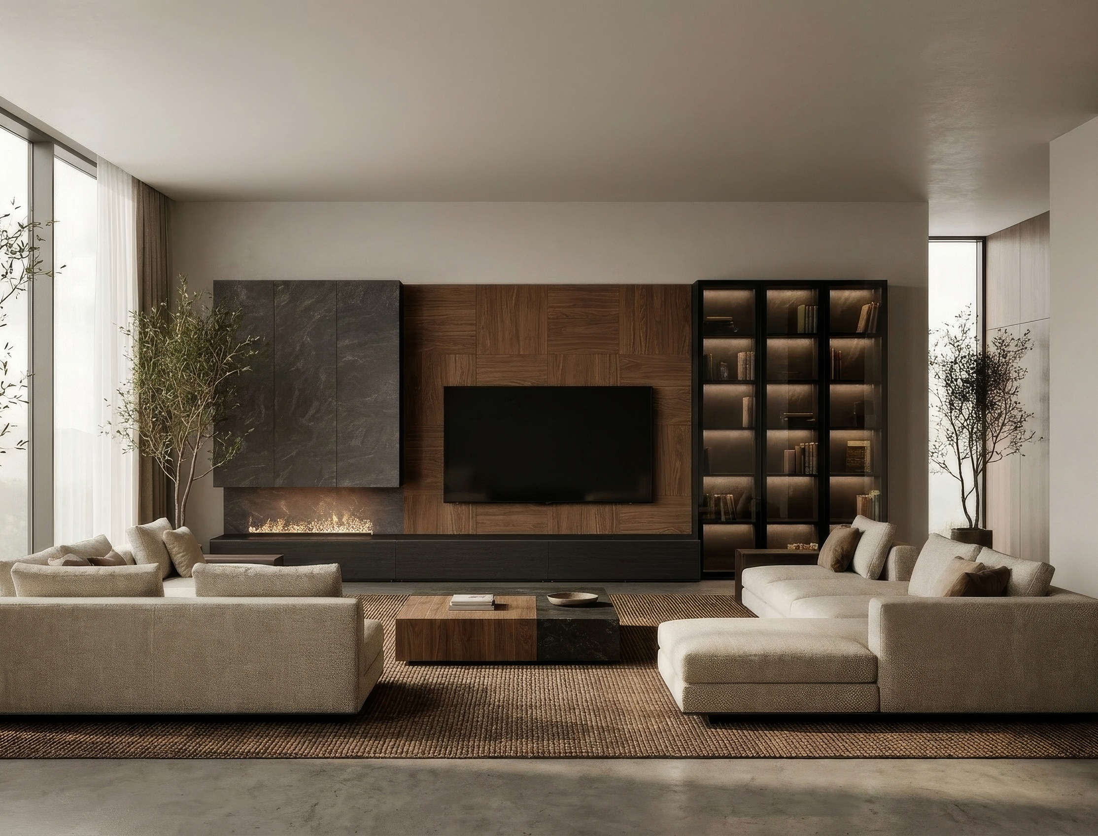 La pared se encuentra revestida con paneles cuadrados de chapa de madera natural de nogal, cambiando la dirección de la veta en cada panel para crear ese juego con el acabado. rodeada a su derecha por tres vitrinas acompañados por tiras de led, en este caso usamos el negro poro para la estructura y la piedra tacande para las traseras. A su izquierda, se ubican tres módulos colgados con gran capacidad de almacenaje que disponen de tres puertas del sistema push to open con acabado también en piedra tacande, Debajo tenemos la chimenea de vapor de manera que estas puertas dan la sensación de tiro de la chimenea.
