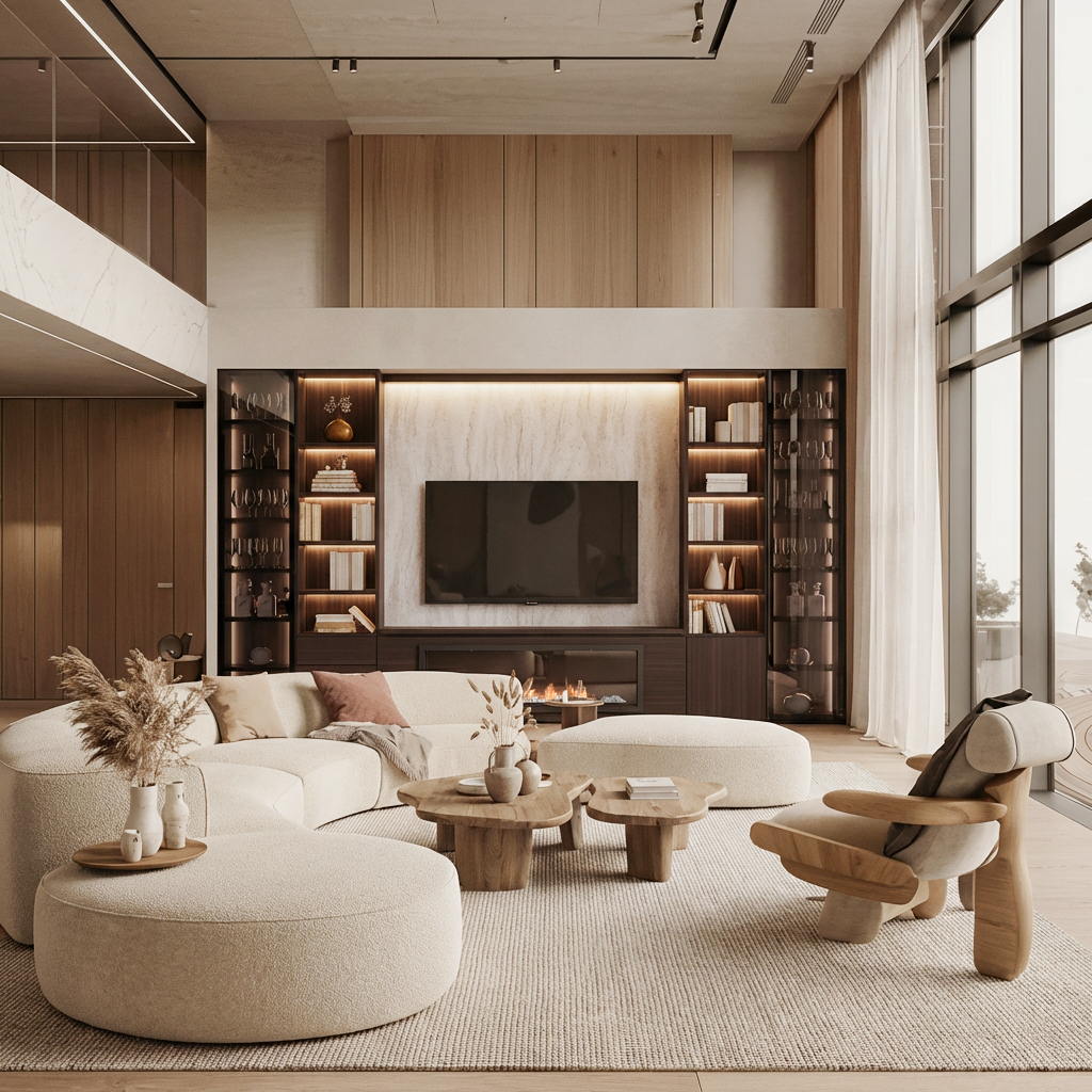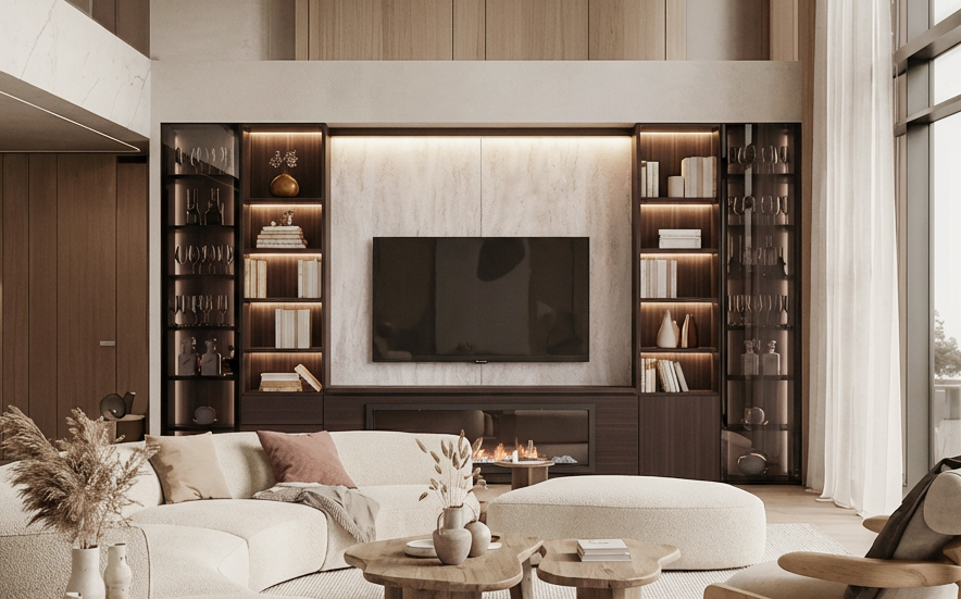 Nuestro mueble de salón con chimenea (Ref: 0815) propone un estilo elegante y llamativo a través de diferentes acabados que combinan a la perfección para generar un ambiente único.