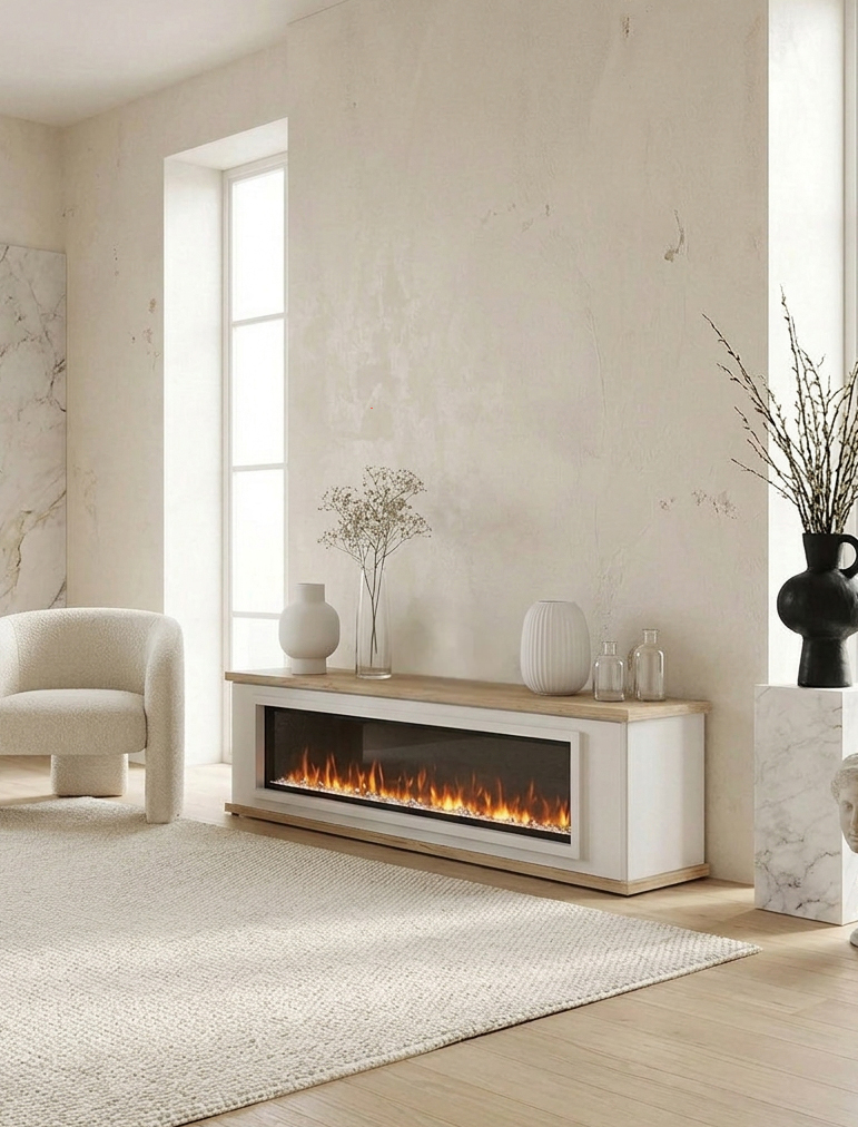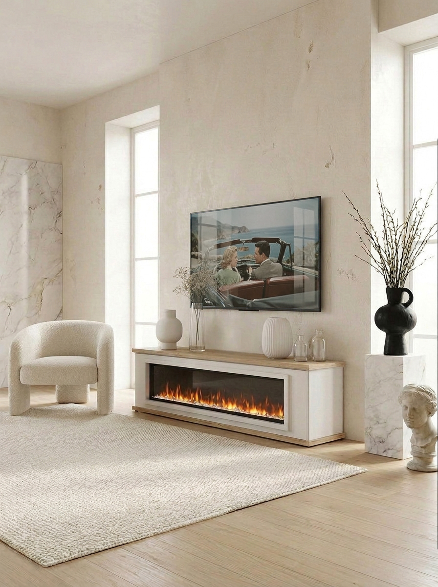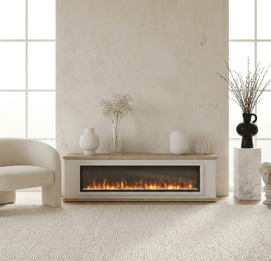 La Chimenea adaptada al mueble, es el modelo Night evolve 19 app de la marca Dimplex. Una chimenea eléctrica de llama óptica que nos ofrece una vista panorámica impecable de llamas parpadeantes. Con la aplicación Flame Connect cambia la experiencia del fuego a tu gusto desde tu teléfono móvil, aunque también disponga de mando a distancia. Puedes elegir entre troncos o piedras como decoración para tu chimenea, las dos opciones incluidas en el paquete. Montada e instalada por el equipo de Luca durante el montaje del mueble. Con solo 5,5 pulgadas de profundidad, y sin necesidad de chimeneas ni tuberías de gas.