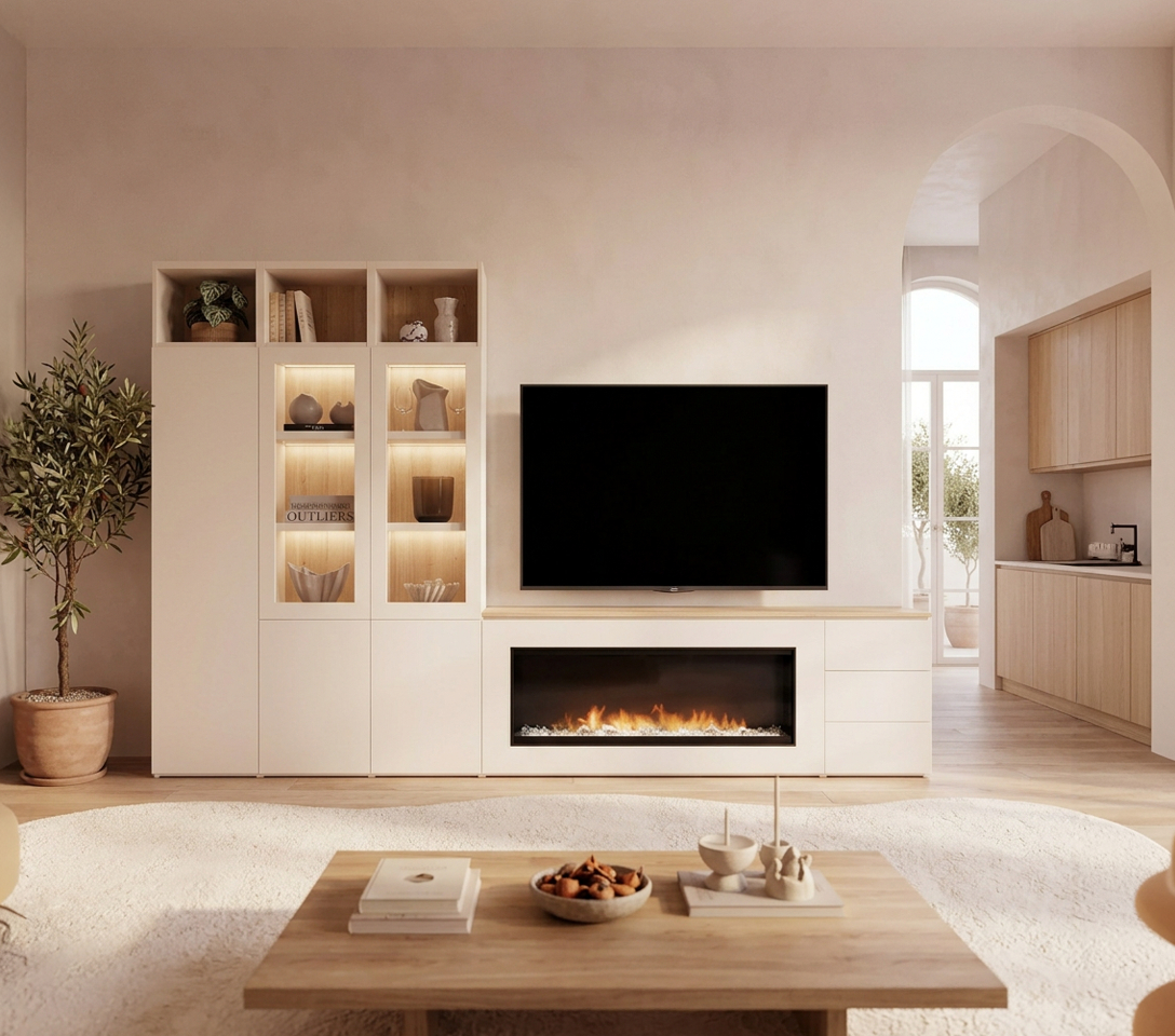 Este exclusivo diseño combina una chimenea eléctrica de última generación con acabados en laminado coco y madera natural de roble nudoso, que aportan calidez y estilo.
